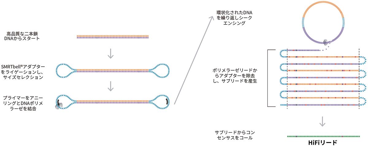 - ヘアピンループ型のアダプターを両末端に結合した、SMRTbellテンプレートと呼ばれる、一分子二本鎖DNAライブラリーとして作成
